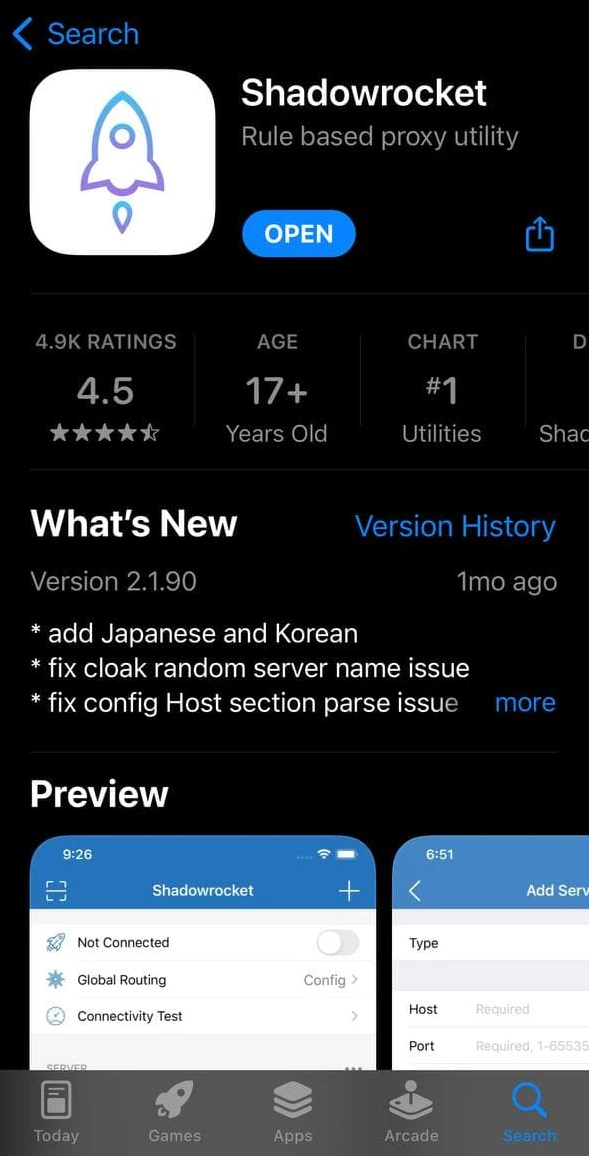 1.1 在美区等非大陆地区官方App Store购买并下载Shadowrocket,点我下载,下载页面如下:
